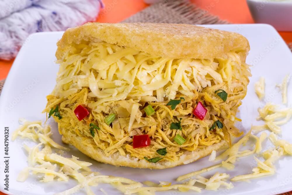 Arepas are a flatbread made of corn and made with special precooked corn flour. Venezuelan arepas have a unique texture that is crispy on the outside and soft on the inside. It is served with Shredded Chicken & Cheese