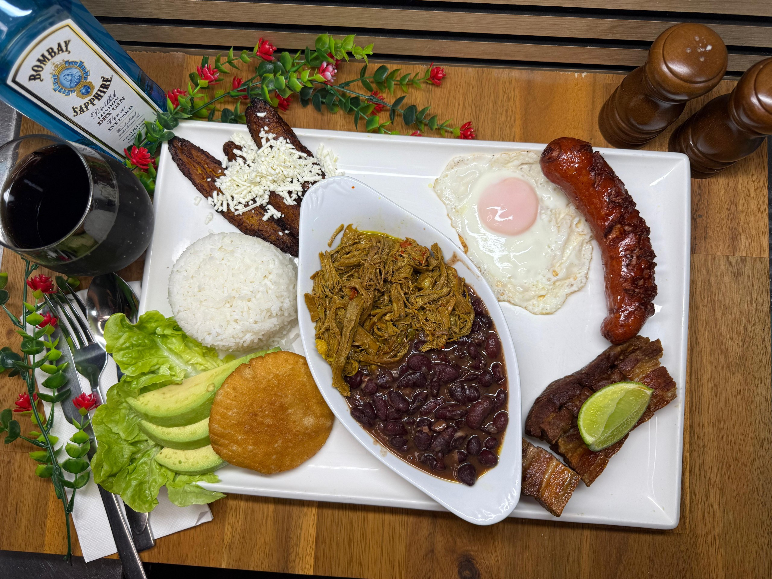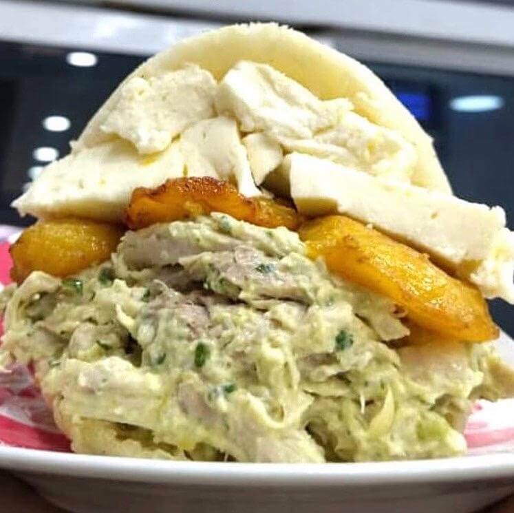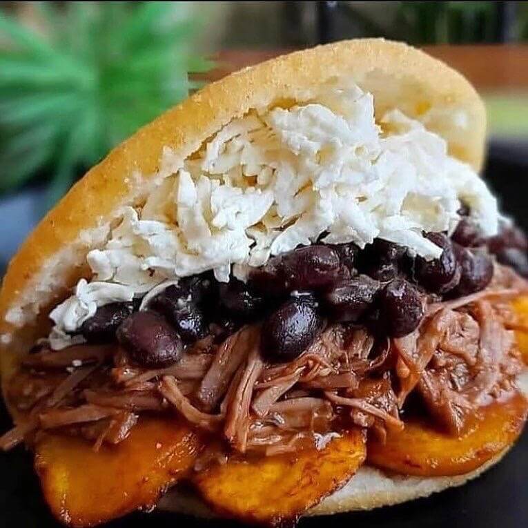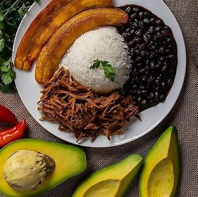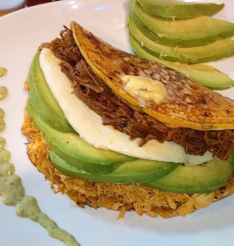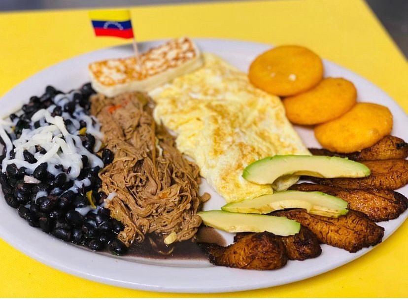 It is a traditional Venezuelan dish that is considered the national dish. It's served with: White Rice / Pulled Beef / Sweet Plantains / Black Beans /Mini Arepa, / Avocado / Egg / Feta cheese