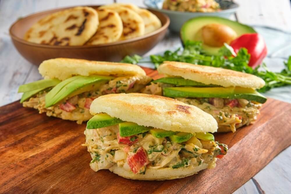 Arepas are a flatbread made of corn and made with special precooked corn flour. Venezuelan arepas have a unique texture that is crispy on the outside and soft on the inside. It is served with Chicken, Avocado, Mayo