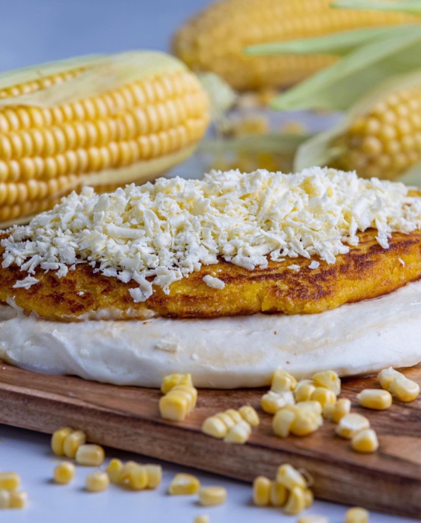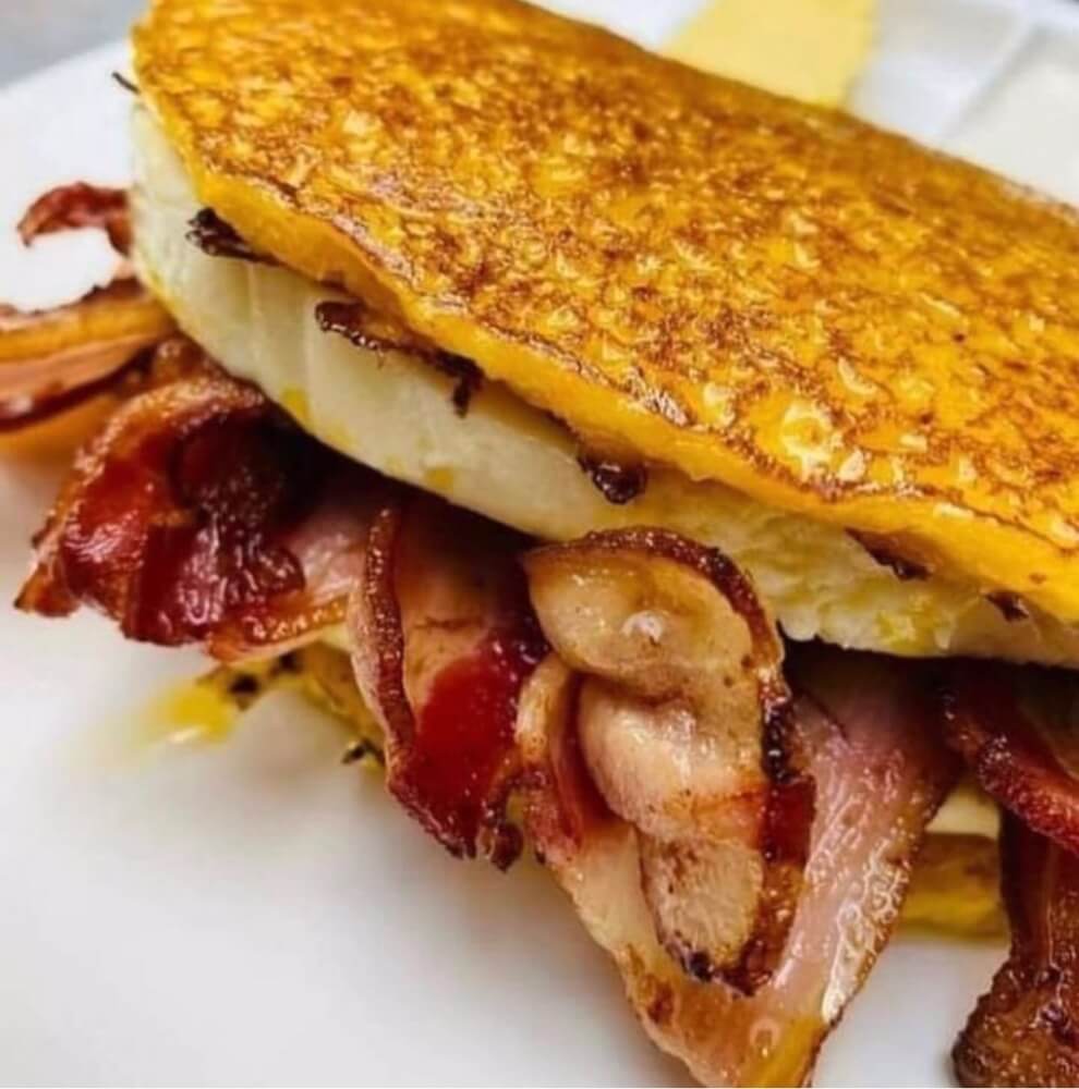 Cachapa is a traditional dish pancake made from fresh sweet corn. It is served with Venezuelan Cheese (Queso de Mano) & Bacon, on the Top (Fetta Cheese & Nata Cream)