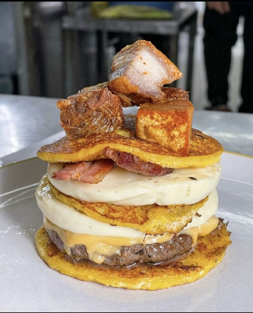Cachapas are tasty Venezuelan corn pancakes that are soft, tender, and packed with fresh corn flavour. Typically filled with melty cheese, they make a delicious savoury snack. It is served with 3 Mini Cachapa, Venezuelan Cheese, Free- Range Beef Patty, chorizo, Cheese, Pork Belly