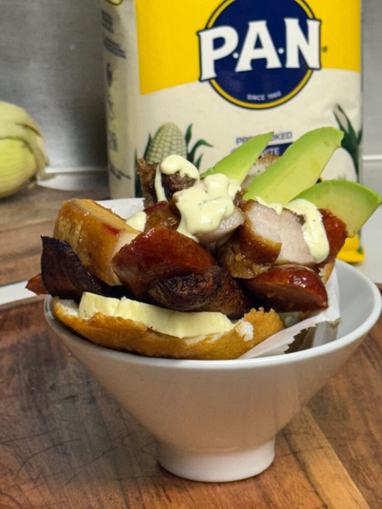 Whole Venezuelan Cheese (Queso de Mano), chorizo, Pork Belly, Steak (Carne a la Llanera), Chicken, Mini Patacon, Avo & Sweet Salad (Cabbage - Carrots- Corn)