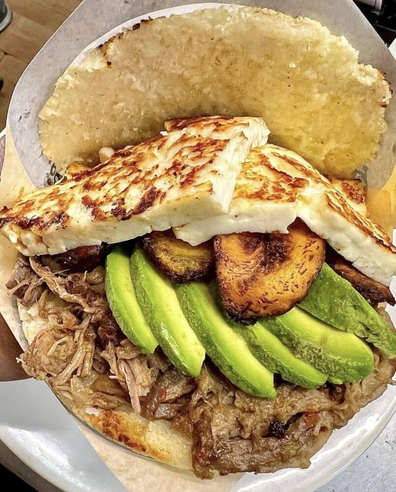 Arepas are a flatbread made of corn and made with special precooked corn flour. Venezuelan arepas have a unique texture that is crispy on the outside and soft on the inside. It is served with Shredded Chicken, Pulled Beef, Avo, Mayo, Sweet Plantains & Cheese