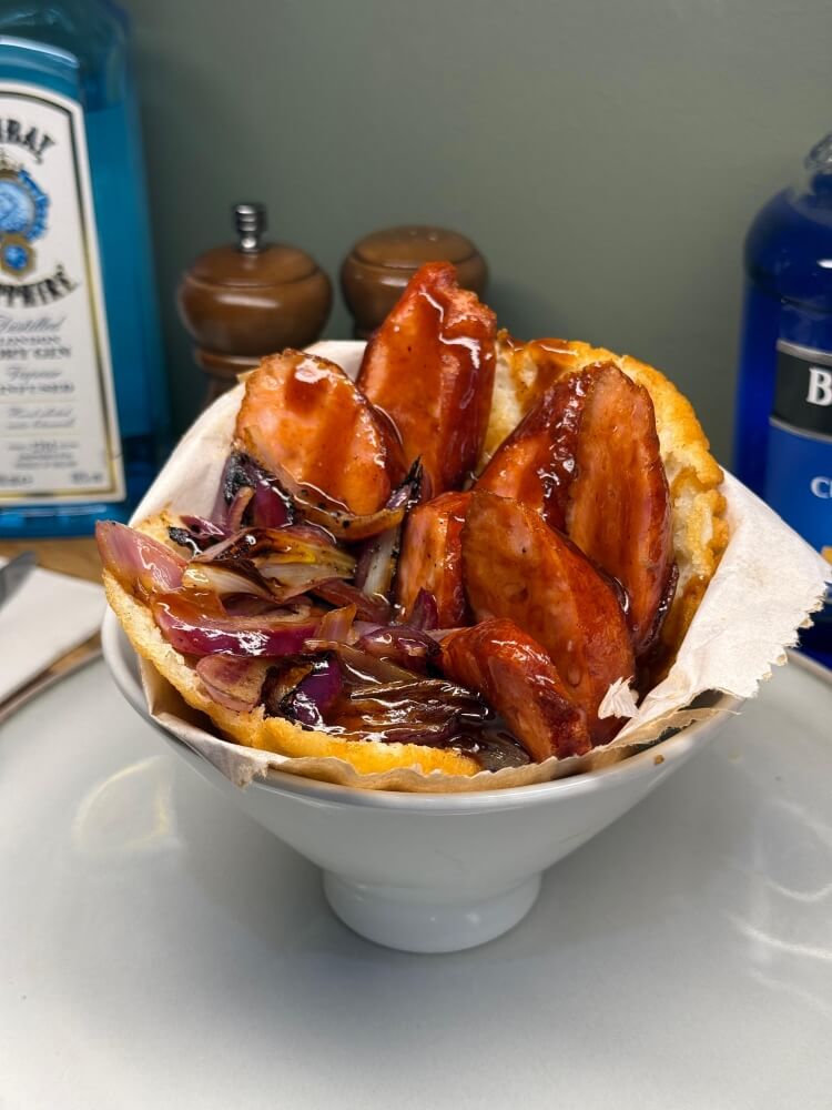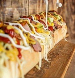 Sausages, chips, lettuce, onion, coriander, fetta & Cheese. Sauce: Tomatoes, House Sauce, BBQ, Mustard, Pineapple