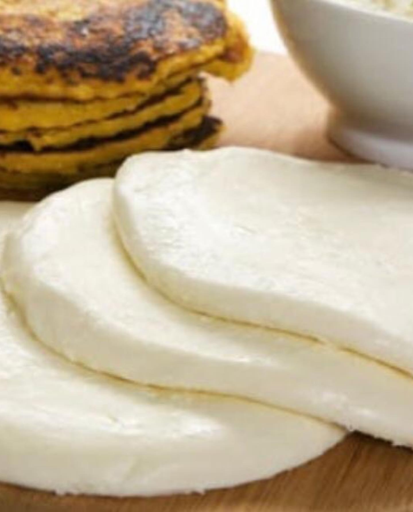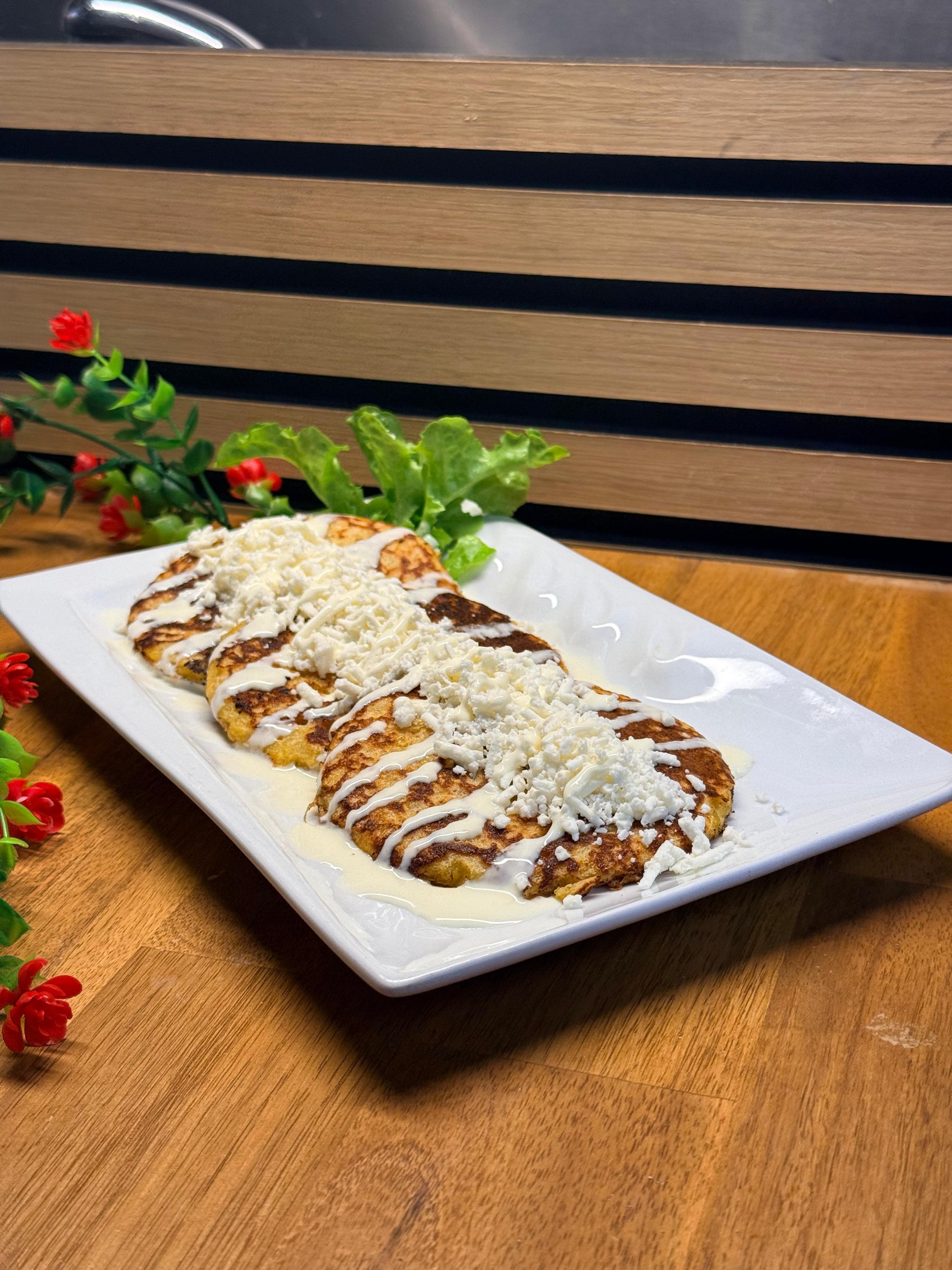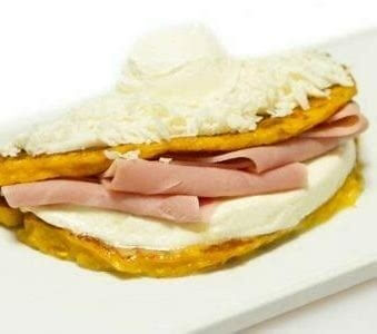 Cachapa is a traditional dish pancake made from fresh sweet corn. It is serve with Venezuelan Cheese (Queso de Mano), on the Top (Fetta Cheese & Nata Cream)