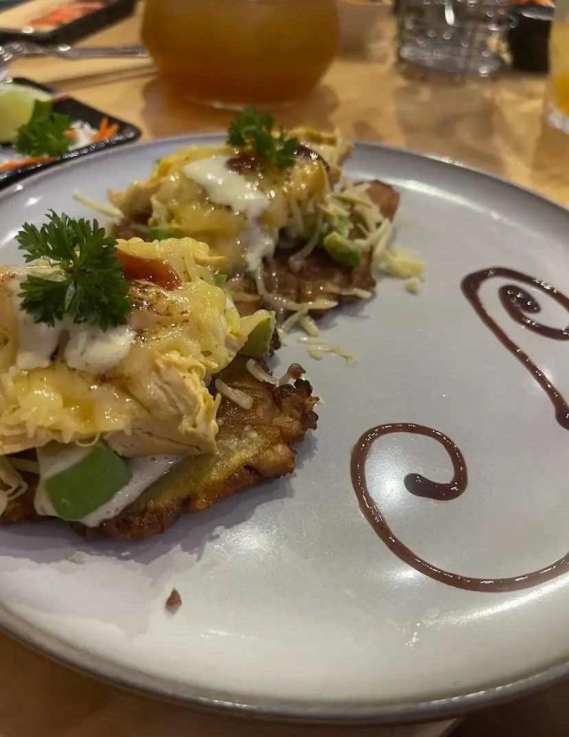Fried Patacon served with lettuce, pulled beef, avo & cheese on top.
