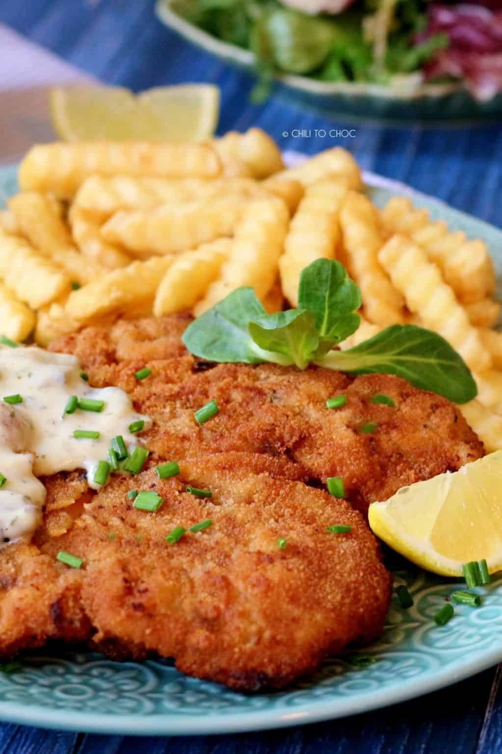 Chicken with crunchy chips and a side of sauce.