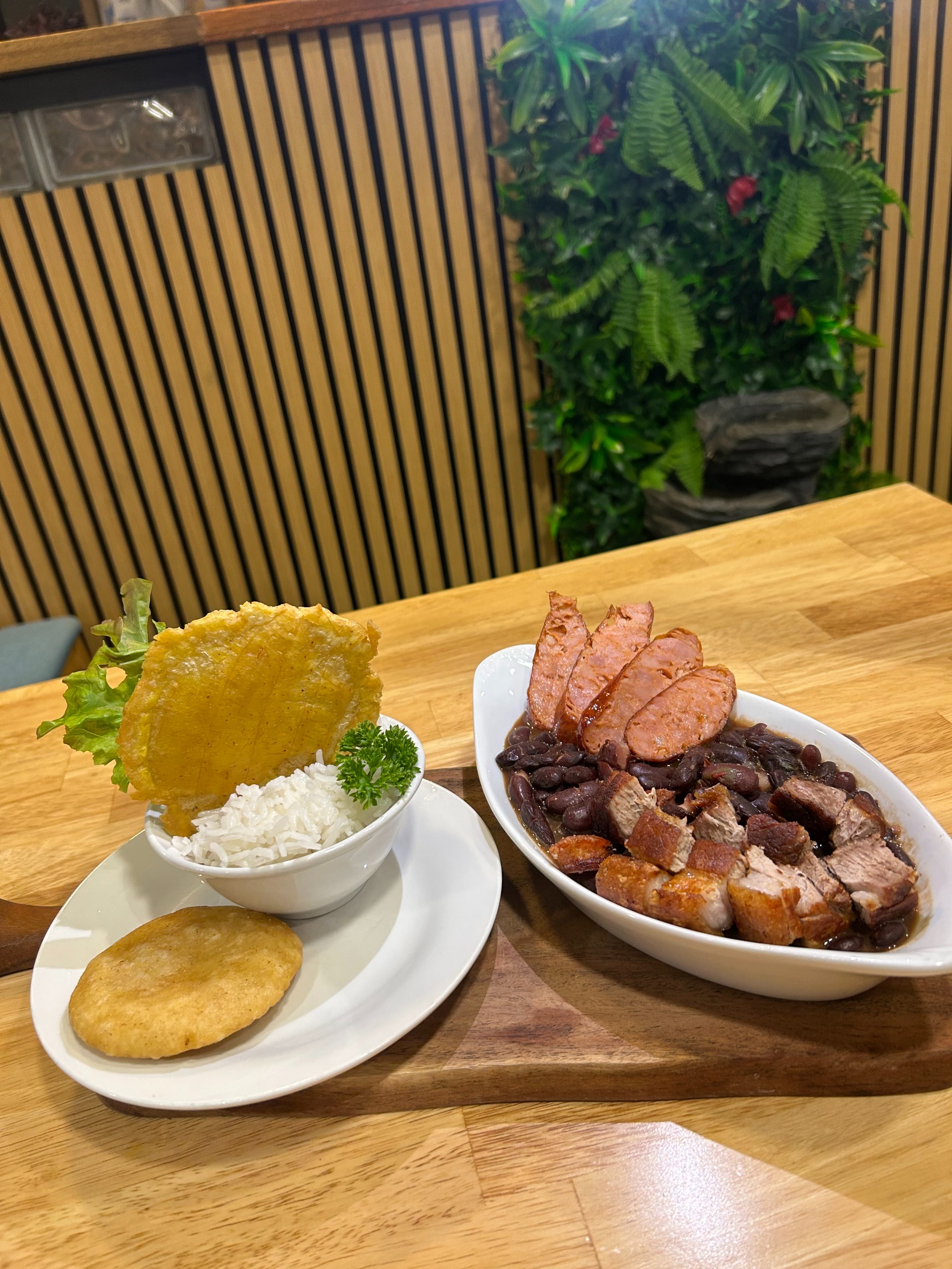 White Rice / Red Beans (casserole)/ Patacon (Green Plantain) / Pork Belly / Chorizo / Mini Arepa / Avocado