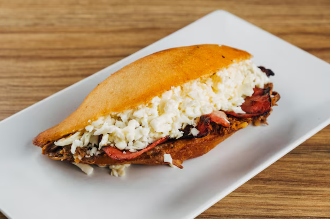 Arepas are a flatbread made of corn and made with special precooked corn flour. Venezuelan arepas have a unique texture that is crispy on the outside and soft on the inside. It is served with Pulled Beef & Cheese