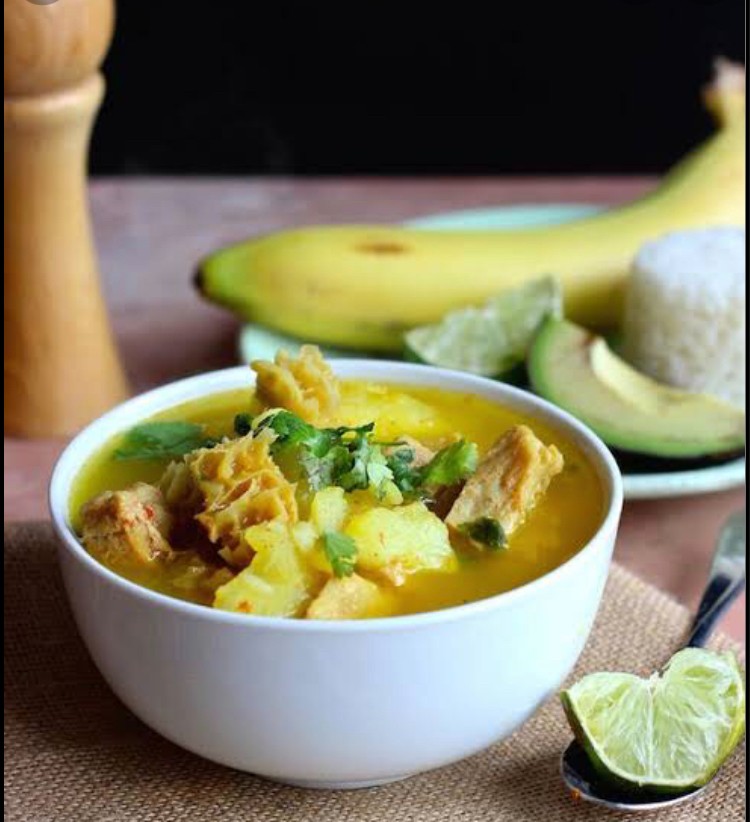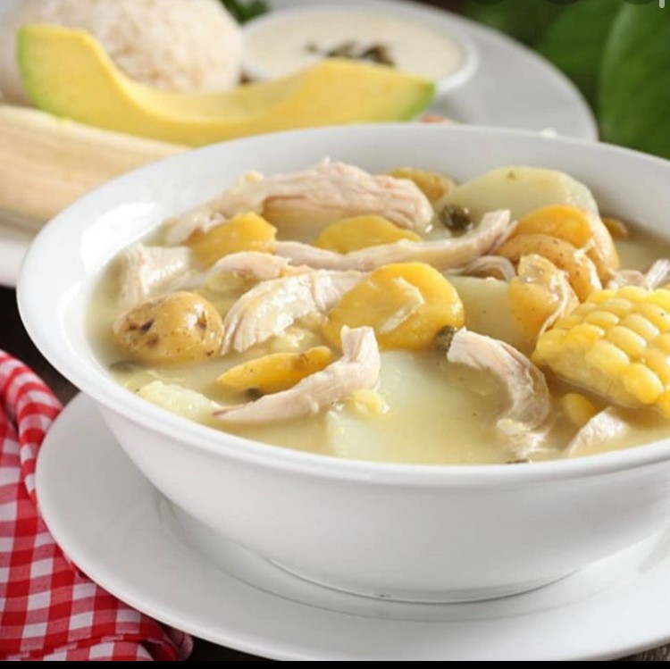 A soup made with various kinds of potato and chicken stock. Served in a bowl topped with shredded chicken and thickened cream, sided with white rice and avocado.