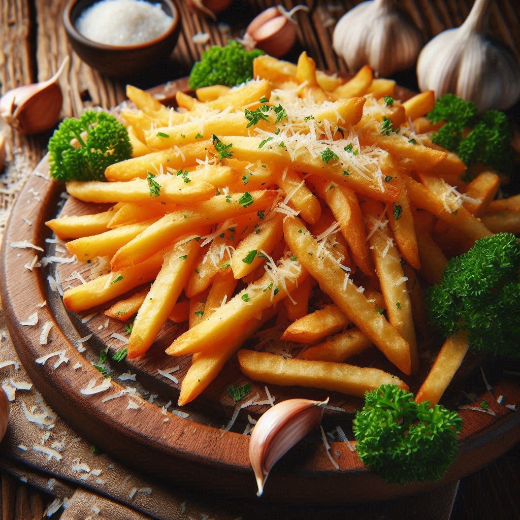 Potato Fries topped with grated parmesan cheese, served with tomatoes and house sauce.