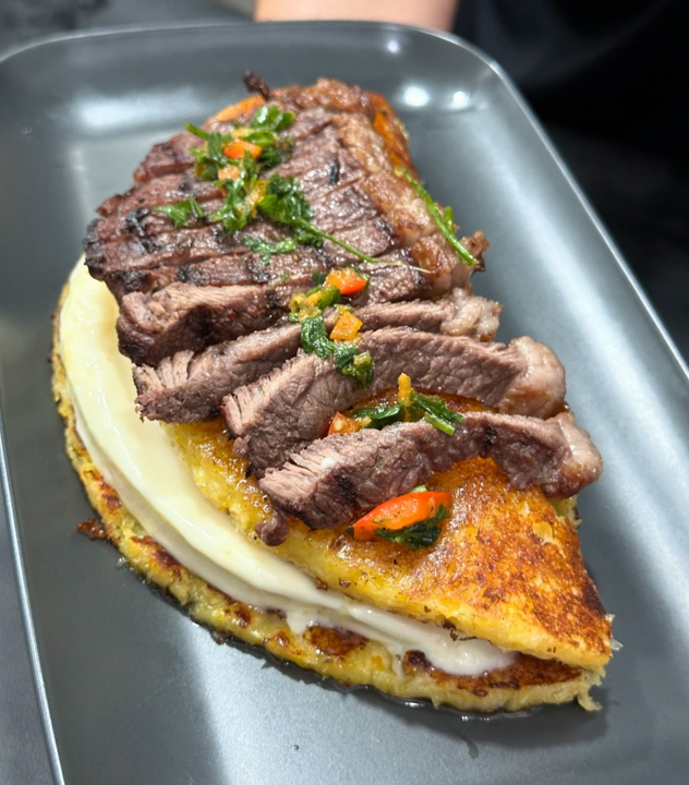 250g Pork Belly, 120G Chorizo, 250g of grilled free-range chicken, 500g steak house served with traditional Cachapa, sweet ripe plantain topped with feta, nata cream & feta, Guacamole, and chimichurri sauce.