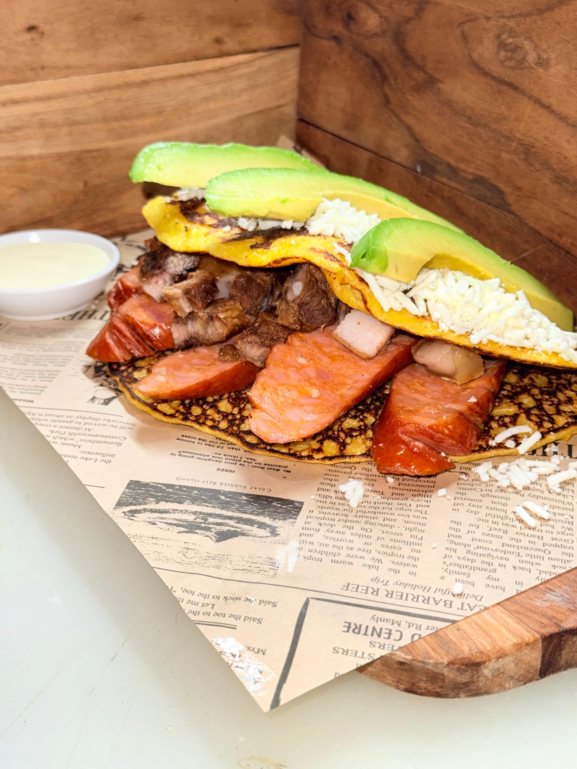Venezuelan cheese, Pork Belly, chorizo, avo. Served with nata cream