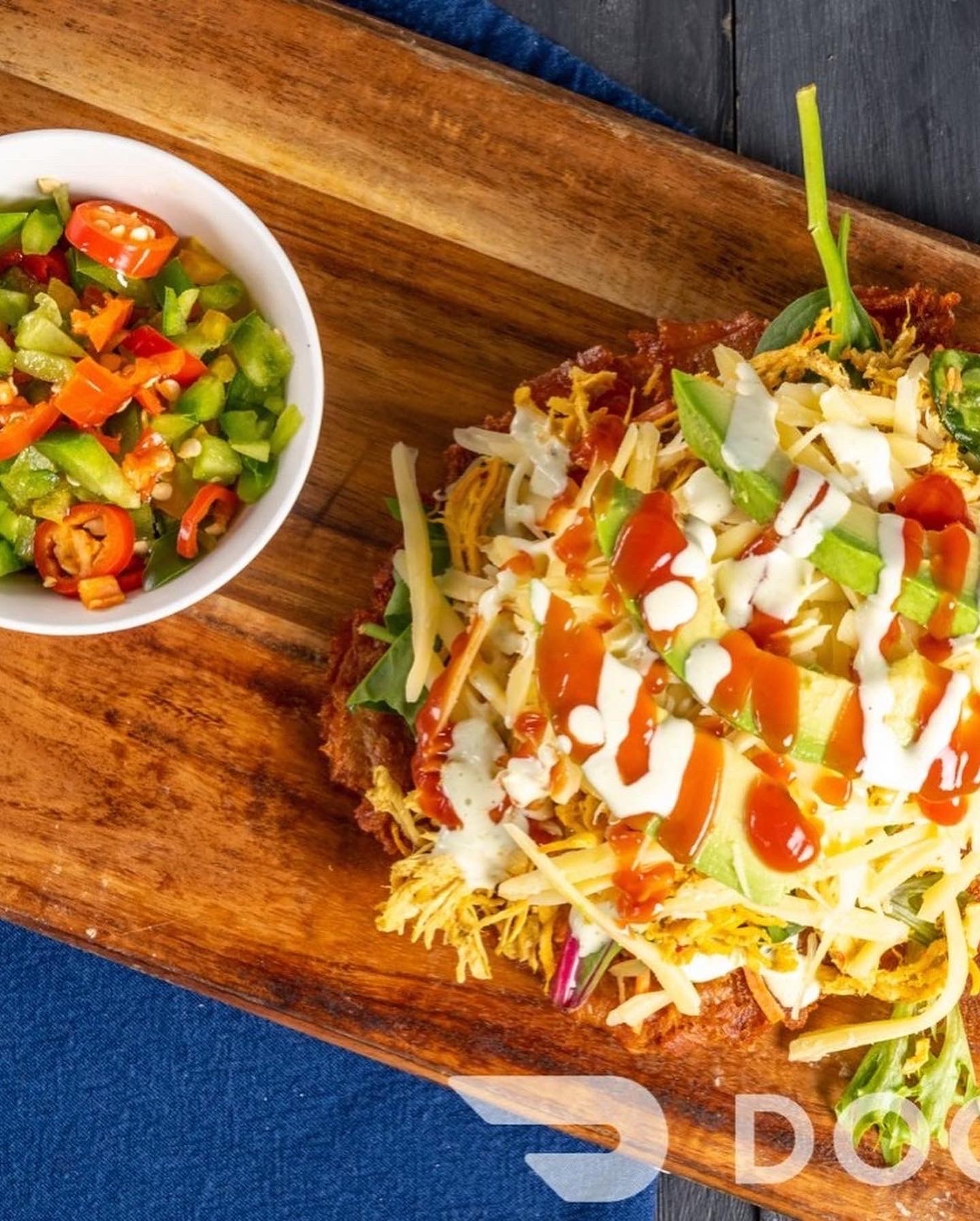 Unripe plantain served with Pulled Beef, Chicken, Green Salads, Avo, Cheese, Corn, Carrots, Sauces