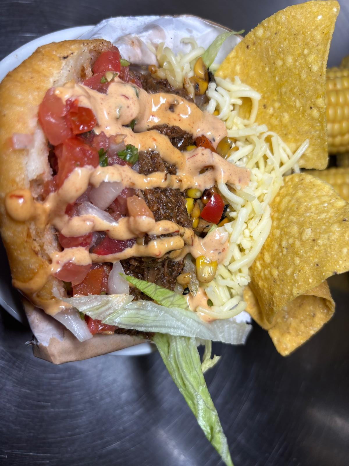 Lettuce, onion, tomatoes, carrots, avo, corn sauce, cheese & house sauce.