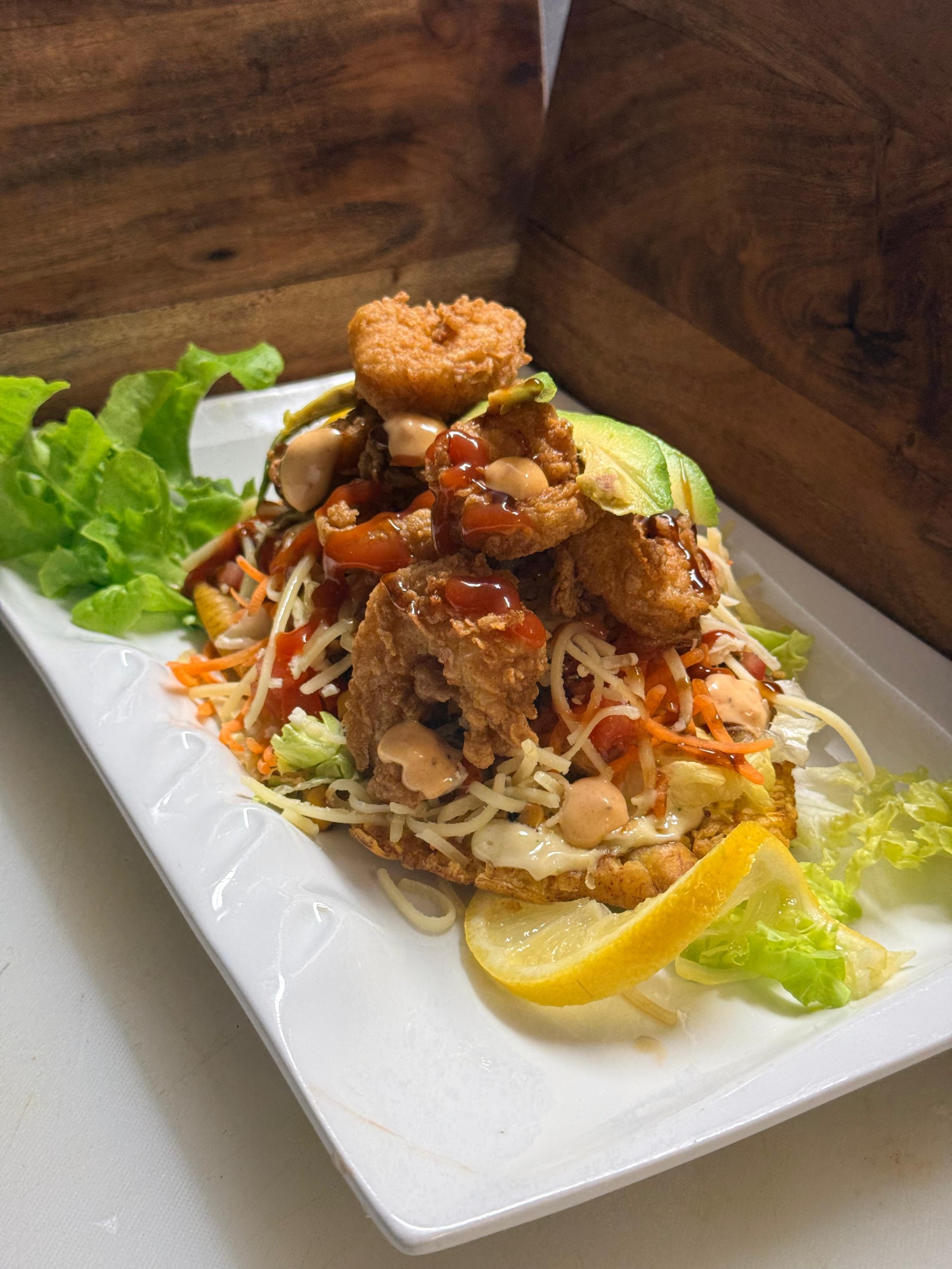 Fried Patacon served with lettuce, halal chicken, pulled beef, avo & cheese on top.